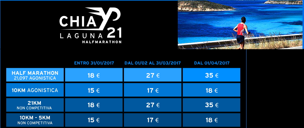 Iscrizioni: le iscrizioni alle gare agonistiche sono aperte dalᅠ1 dicembre fino alle ore 24 di giovedìᅠ27 aprile 2017. Alle corse non competitive è possibile iscriversi online entro il giorno venerdì 28 aprile e nei giorni venerdì 28, sabato 29 aprile e domenica 30 aprile di persona presso la segreteria Chia Laguna Half Marathon, situata nel Conference Center del Chia Laguna Resort.