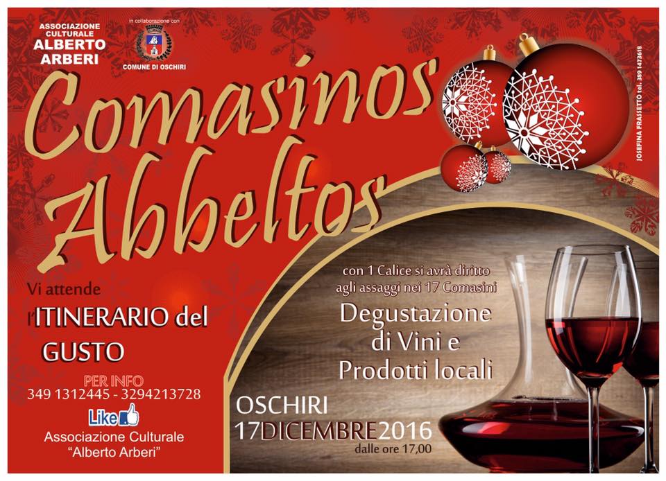 Sabato 17 dicembre 2016 appuntamento ad Oschiri per la quarta edizione di “Comasinos Abbeltos“, gustosa manifestazione dedicata al vino, ai cibi e ai sapori locali. Acquistando un calice si avrà infatti diritto agli assaggi tra i 17 comasinos con la possibilità di degustare autentiche prelibatezze locali come la zuppa cadduresa, panadas, ghisadu de ainu, pulpedda, casu arrustu, fagiolata di fregola e guanciale al vino rosso, fettine d’asino ma anche calamari, cozze e mangiattutto, senza dimenticare seadas, dolci tipici.
