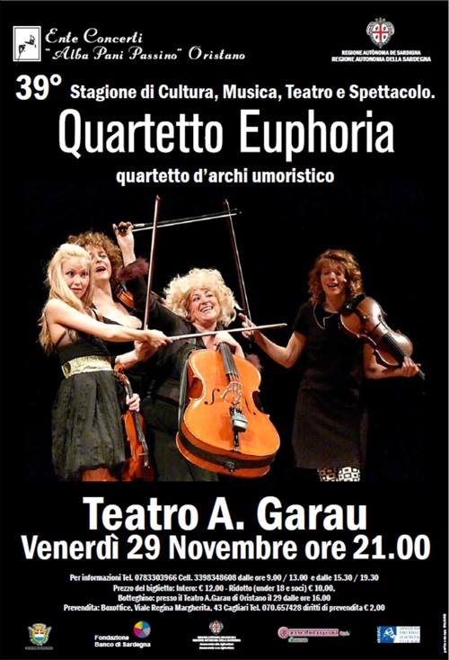 CONCERTO SPETTACOLO UMORISTICO DEL QUARTETTO EUPHORIA – TEATRO GARAU – ORISTANO – VENERDI 29 NOVEMBRE 2013THE SHOW CONCERT HUMOR QUARTETTO EUPHORIA – GARAU THEATRE – ORISTANO – FRIDAY NOVEMBER 29 Reviewed by admin on . Venerdi 29 Novembre - Teatro Garau, Oristano Concerto- spettacolo umoristico del quartetto d'archi Euphoria Un ensemble tutto al femminile, che coniuga con inte Venerdi 29 Novembre - Teatro Garau, Oristano Concerto- spettacolo umoristico del quartetto d'archi Euphoria Un ensemble tutto al femminile, che coniuga con inte Rating: