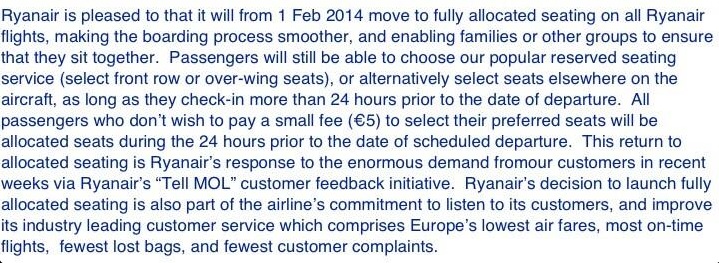 After the operation kindness, the second carry-on bag (or purse), the elimination of the captcha code, and the simplification of the bookings and the improvement of their website, in a tweet yesterday, the Irish giant announces free allocation of the seats on their planes from the month of February 2014