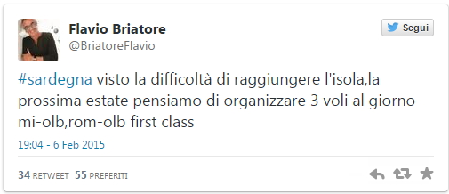 E’ quanto si intuisce dai cinguettii su Twitter di Flavio Briatore, Â ex proprietario del ‘Billionaire’Â - punto di riferimento di quella Costa Smeralda conosciuta per i fiumi di champagne e i tantissimi vip che affollano i locali e le spiagge d’estate.