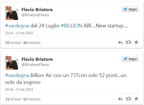 Dal 24 luglio 2015 nasce la Billion Air, una nuova compagnia aerea destinata ai voli First Class tra Olbia e la capitale ufficiale,Roma e quella,economica.