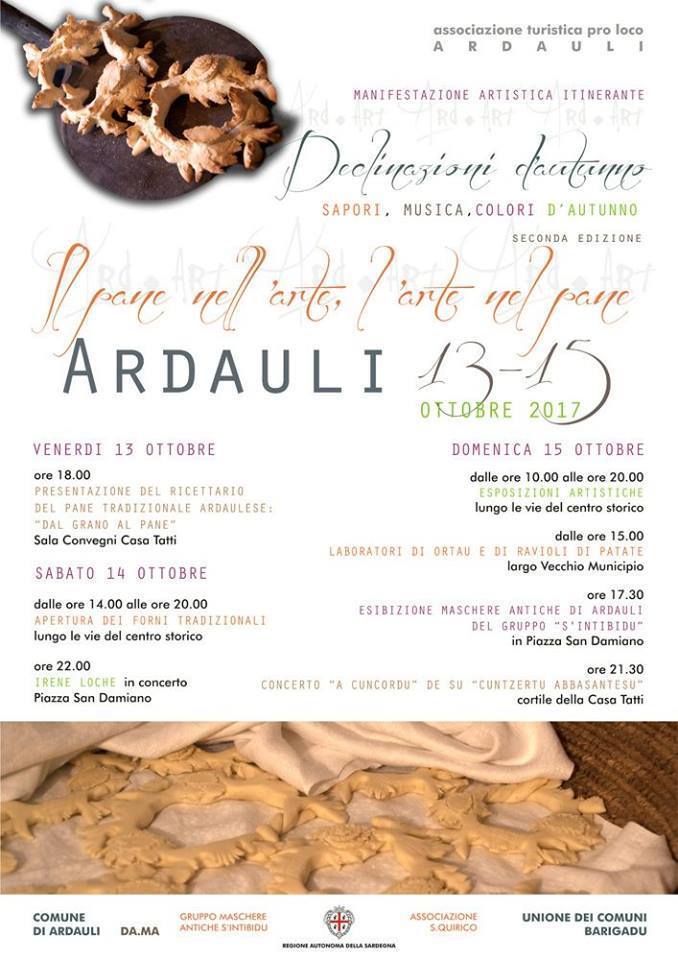 La seconda edizione di Declinazioni d’Autunno, si svolgerà come di consueto, lungo le vie del centro storico di Ardauli. Si tratta di una grande mostra d’arte ma quest’anno il tema trascinante sarà il PANE…il pane tradizionale con le sue molteplici forme e varietà .