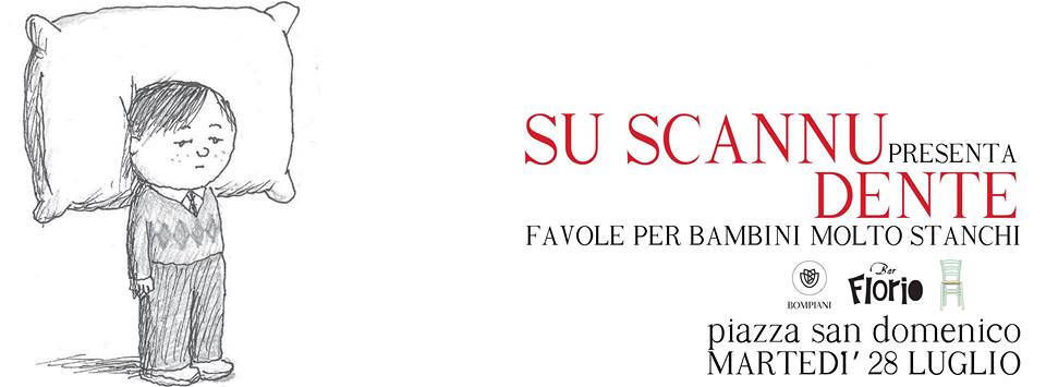 Il primo appuntamento letterario organizzato da Su Scannu, in collaborazione con il Bar Florio e la Bompiani editore. Il tutto si svolgerà all’aperto, nella piazza S. Domenico, potrete portarvi le sedie da casa, o qualcosa per non stare in piedi; noi la nostra seggiola la cederemo al cantautore Giuseppe Peveri, in arte Dente, che presenterà il suo libro ‘Favole per Bambini Molto Stanchi’.