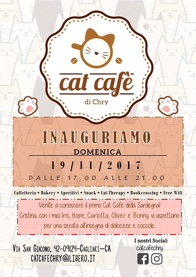 Se amate gli animali e soprattutto i gatti segnatevi questa data – domenica ,19 novembre 2017- e questo indirizzo – via San Giacomo 42, nel quartiere Villanova a Cagliari – , perchè lì sta per aprire il primo Cat Cafè della Sardegna. Di cosa si tratta? Di un caffè che come dice il nome è stato pensato per gli amanti dei gatti, oltre ad un’ampia scelta di caffetteria, bakery, drinks, snack dolci e salati, saranno disponibili i servizi di bookcrossing e di wifi gratuito.