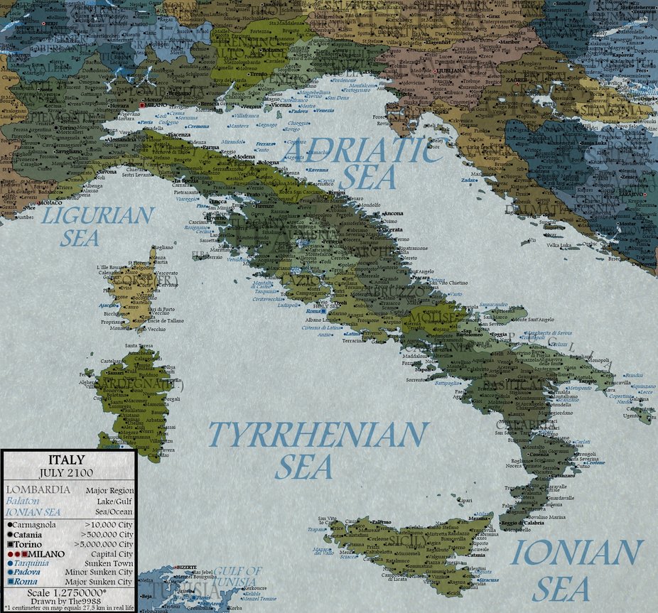Ecco come potrebbe presentarsi l’Italia nel 2100. La ricostruzione grafica è stata eseguita dal portale http://the9988.deviantart.com e raffigura uno scenario a dir poco preoccupante, dovuto ai cambiamenti climatici ed al riscaldamento globale.