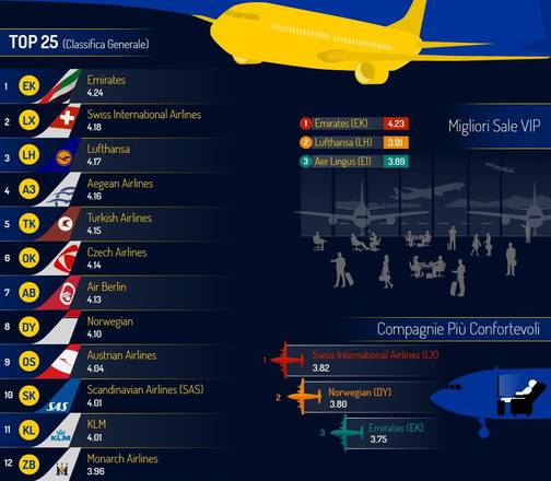 Con un punteggio medio di 4.24, la compagnia di Dubai si è piazzata in testa alla classifica, sbaragliando la concorrenza di Singapore Airlines, prima nel 2012 e nel 2013. Medaglia di bronzo, con voto medio 4.18, a Swiss International Airlines, tallonata da Lufthansa (4.17). Emirates si è aggiudicata anche il titolo come miglior compagnia aerea anche nelle categorie pulizia e modernità dell’aereo, intrattenimento e servizio a bordo, gestione dei bagagli e sala vip. I sedili più confortevoli sono quelli della compagnia di bandiera svizzera, mentre per chi viaggia con bimbi al seguito il miglior servizio è quello offerto da Czech Airlines.