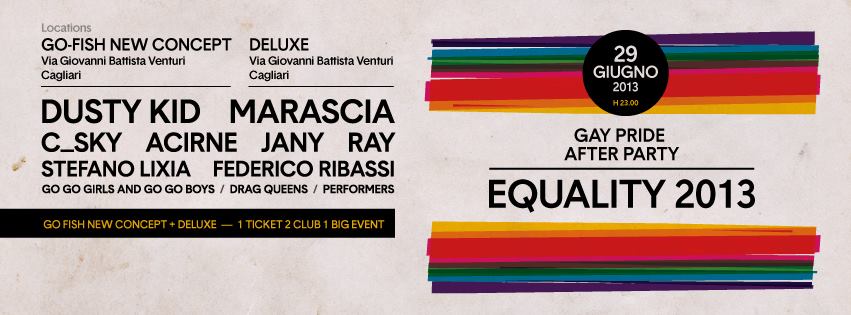 EQUALITY 2013 – GO FISH & DELUXE DISCO CLUB – CAGLIARI – SABATO 29 GIUGNOEQUALITY 2013 – GO FISH & DELUXE DISCO CLUB – CAGLIARI – SATURDAY JUNE 29th