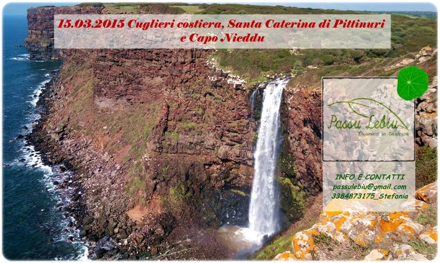 Questa domenica 15 marzo Passu Lebiu ripercorre un suggestivo itinerario nel territorio di Cuglieri, partendo dalla borgata marina di Santa Caterina di Pittinuri ed arrivando a ridosso della particolarissima cascata a mare di Capo Nieddu. All’inizio del nostro percorso cammineremo in prossimità di una fascia costiera di roccia calcarea dai profili dolci ed ondulati; in seguito ci immergeremo nella profumata macchia costiera per raggiungere aspre e scure falesie da cui si liberano alcune cascate a mare fra cui il più imponente e noto salto di Capo Nieddu, probabilmente unico nel suo genere nel territorio sardo quanto a conformazione e portata, seppur stagionale…