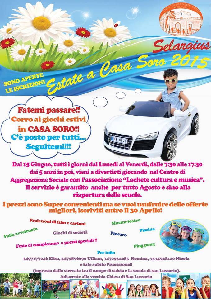 ESTATE 2015 PER BIMBI E RAGAZZI A CASA SORO A SELARGIUS Reviewed by admin on . A CASA SORO INIZIANO le prenotazioni per l'attività estiva BAMBI e RAGAZZI. Solo per chi inizia a versare la quota da APRILE PAGHERA' per 4 Settimane solo 170€, A CASA SORO INIZIANO le prenotazioni per l'attività estiva BAMBI e RAGAZZI. Solo per chi inizia a versare la quota da APRILE PAGHERA' per 4 Settimane solo 170€, Rating: 0