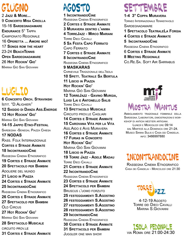 Ma i vacanzieri hanno bisogno anche di sfuggire la canicola estiva divertendosi, specie alla sera, tra la marea di eventi che ogni estate anima le nostre coste. In questo caso ecco tutti gli eventi di Luglio, Agosto e Settembre 2012 a Muravera tra danze, musica folk, jazz, rassegne cinematografiche, sport, spettacoli per bambini e tanto altro ancora!
