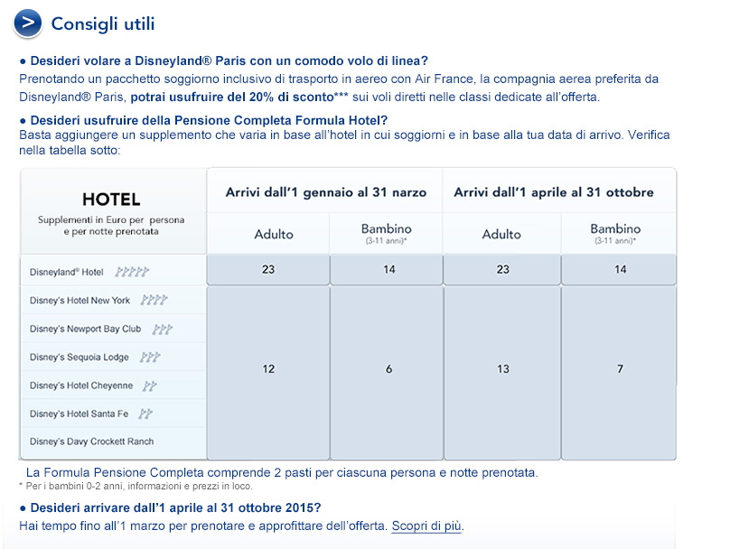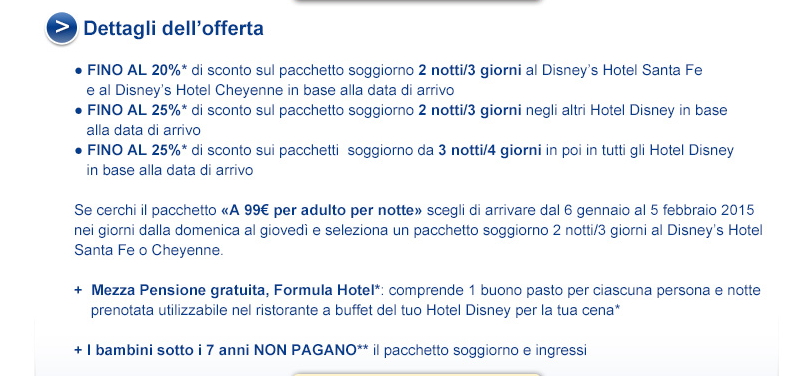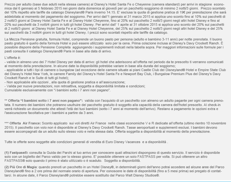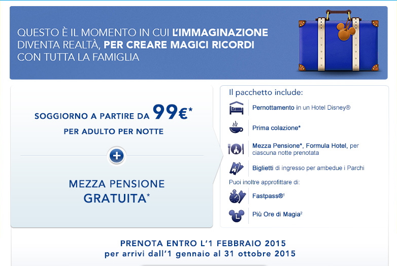 Nuova offerta per il 2015 a Eurodisney vicino a Parigi: soggiorni a partire da 99 € per adulto per notte più mezza pensione gratuita, biglietti per entrambi i parchi compresi, fast pass.