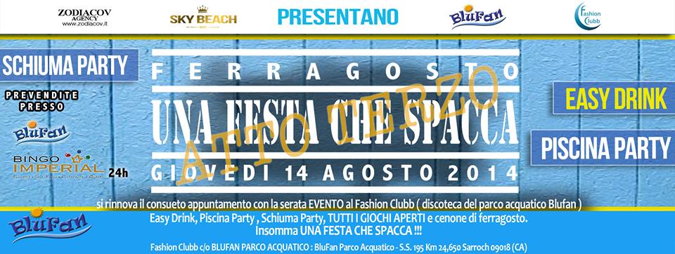 FERRAGOSTO – UNA FESTA CHE SPACCA – ATTO TERZO – BLUFAN – SARROCH – GIOVEDI 14 AGOSTO 2014FERRAGOSTO PARTY 3th EDITION- BLUFAN – SARROCH – THURSDAY AUGUST 14,2014 Reviewed by admin on . Giovedi 14 agosto, dalle ore 21:00; Easy Drink, Piscina Party, Schiuma Party, TUTTI I GIOCHI APERTI + Cenone di Ferragosto, insomma UNA FESTA CHE SPACCA!!! :::: Giovedi 14 agosto, dalle ore 21:00; Easy Drink, Piscina Party, Schiuma Party, TUTTI I GIOCHI APERTI + Cenone di Ferragosto, insomma UNA FESTA CHE SPACCA!!! :::: Rating: 0