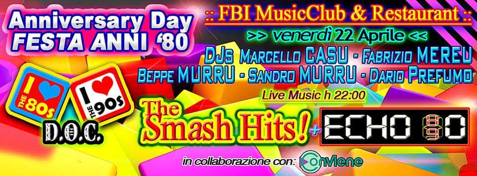 L’appuntamento è Venerdì 22 Aprile 2016 alle 22,00 FONDAMENTALE ARRIVARE PRESTO perché suoneranno 2 Gruppi Live gli SMASH HITS e gli ECHO 80.