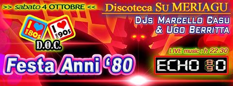 GRANDISSIMO AMICI!!!!!!! Sabato 4 Ottobre ritorna la famosissima festa anni 80/90… Nella discoteca di Su Meriagu, serata che partirà alle 22.30 con il live degli Echo 80, e a seguire la FESTA con musiche dei dj Marcello Casu e Ugo Berritta. Prevendite al costo di 10€ … Per prenotazioni: 3287128390 MARCO P.