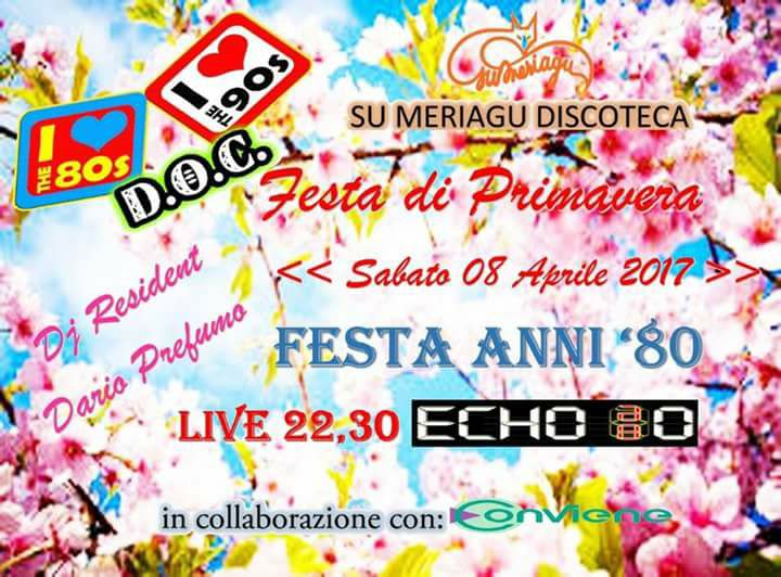 Sabato festa anni 80 per festeggiare la PRIMAVERA a SU MERIAGU con la musica Live degli Echo 80 capitanata dal mitico Pierpaolo Abis ed a seguire il musichino Doc del grande Dario Prefumo..per info e prevendite contattatemi al 328/9197988