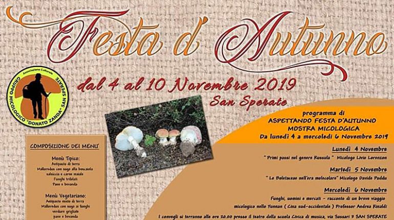si svolgerà sabato e domenica, il 9 e 10 novembre 2019, in piazza New York e piazza Gramsci a San Sperate (al centro del paese, vicino al semaforo), la manifestazione “Festa d’Autunno” organizzata dall’ associazione Culturale “Gruppo Micologico Donato Zanda” con il patrocinio dell’Amministrazione Comunale. La manifestazione, che ruota attorno alla “Mostra micologica“, la quale giunge così alla sua sesta edizione. La mostra è curata dal Micologo Davide Puddu, il quale, in collaborazione con soci e simpatizzanti, metterà in esposizione le specie fungine tipiche del periodo autunnale provenienti da vari punti della Sardegna in rappresentanza di vari habitat di crescita.