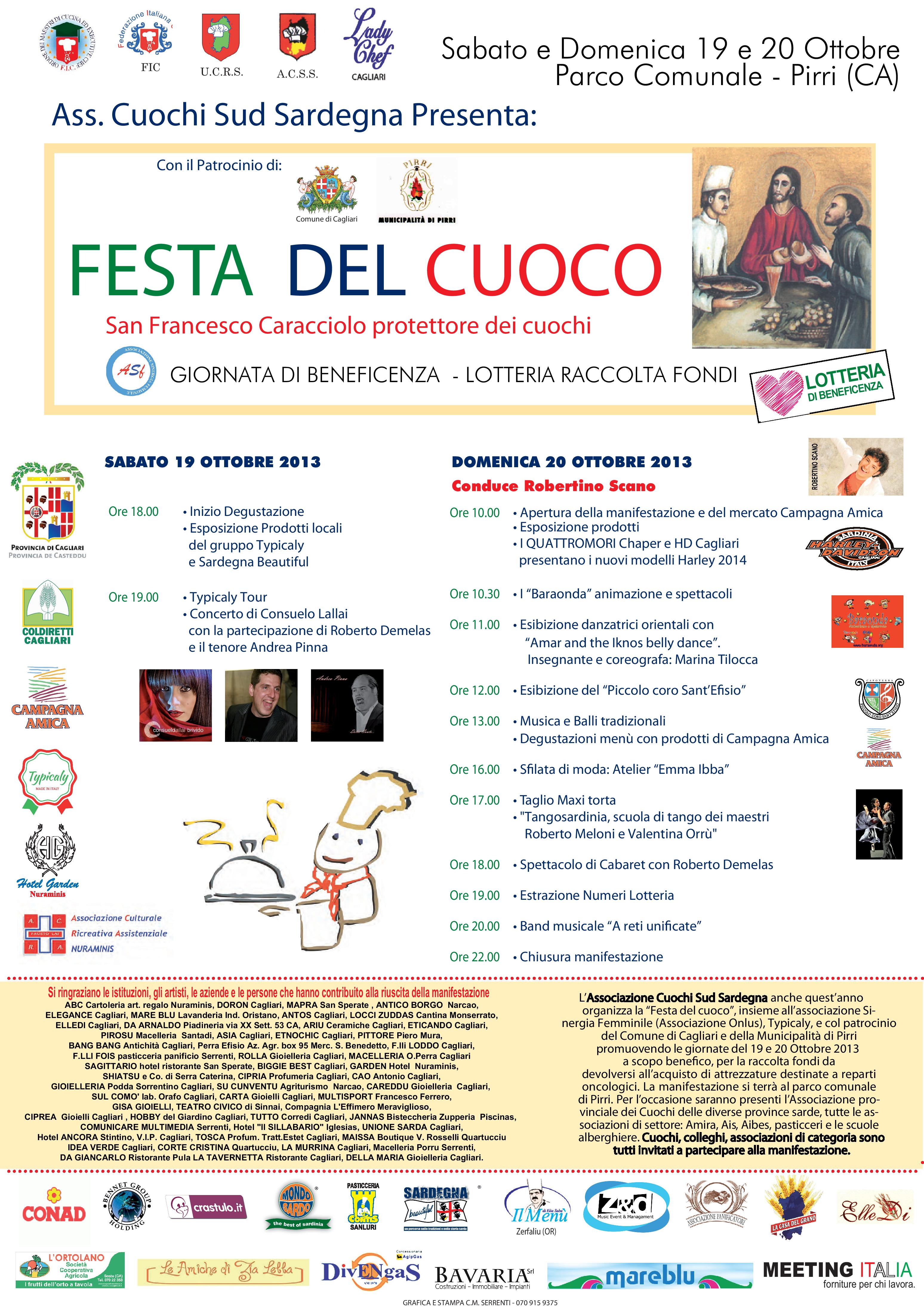 Manifesto  festa del cuoco 2013 definitivo-page-001L’Unione Cuochi Regione Sardegna e l’Associazione Cuochi Sud Sardegna, insieme all’Associazione Sinergia Femminile (Associazione Onlus), con il patrocinio del Comune di Cagliari, della Municipalità di Pirri, la collaborazione della Coldiretti di Cagliari e il contributo delle Attività Produttive della Provincia  di Cagliari anche quest’anno organizza la “Festa del cuoco” che si terrà il 19/20 ottobre 2013  al Parco Ex Vetreria a Pirri. L’iniziativa ha come obiettivo la raccolta di fondi per l’acquisto di attrezzature che saranno destinate ai reparti oncologici.