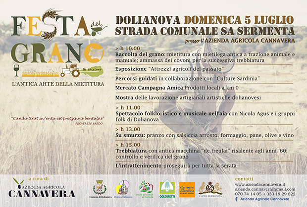– A Dolianova, presso l’Azienda Agricola Cannavera sulla Strada Comunale Sa Sermenta, per tutta la giornata di Domenica 5 Luglio 2015 a partire dalle ore 10 prenderà il via la Terza edizione della Festa del Grano, l’Antica Arte della Mietitura.