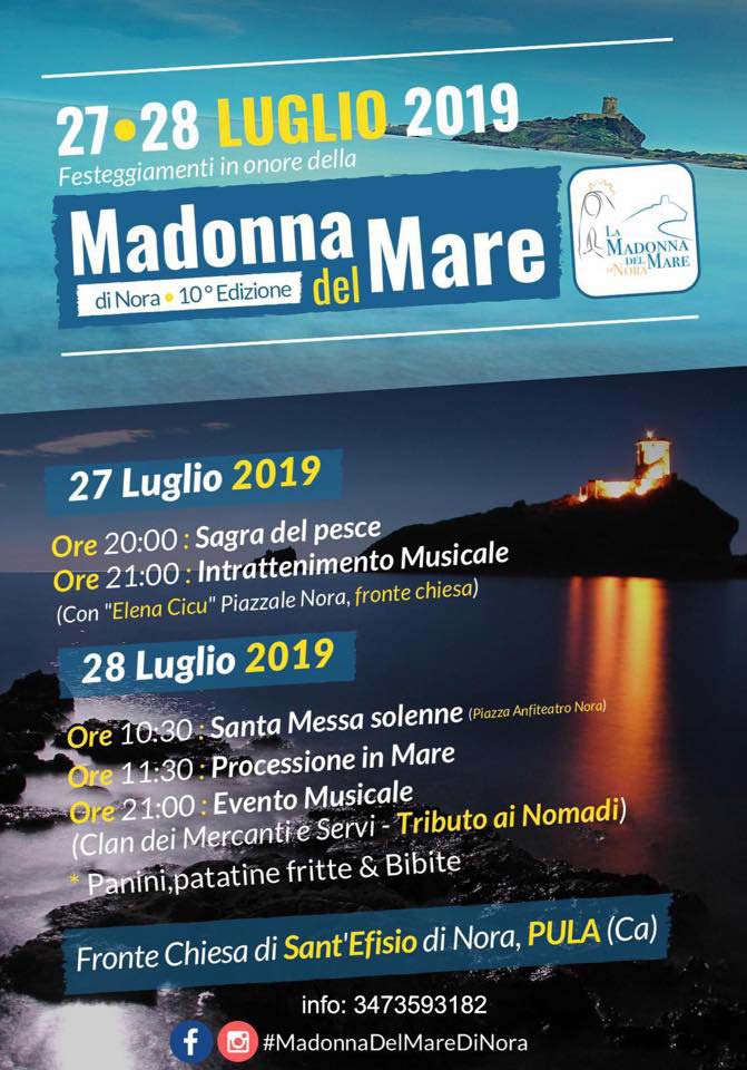 si svolgerà il 27 e 28 luglio 2019 a Nora, l’antica frazione a mare di Pula (nel sud ovest della Sardegna), la decima edizione della “Festa della Madonna del mare“, con la consueta processione in mare nella giornata di domenica. Nella giornata di sabato, nel piazzale di fronte alla chiesetta di Sant’Efisio a Nora, da non perdere la immancabili “Sagra del Pesce“.Â
