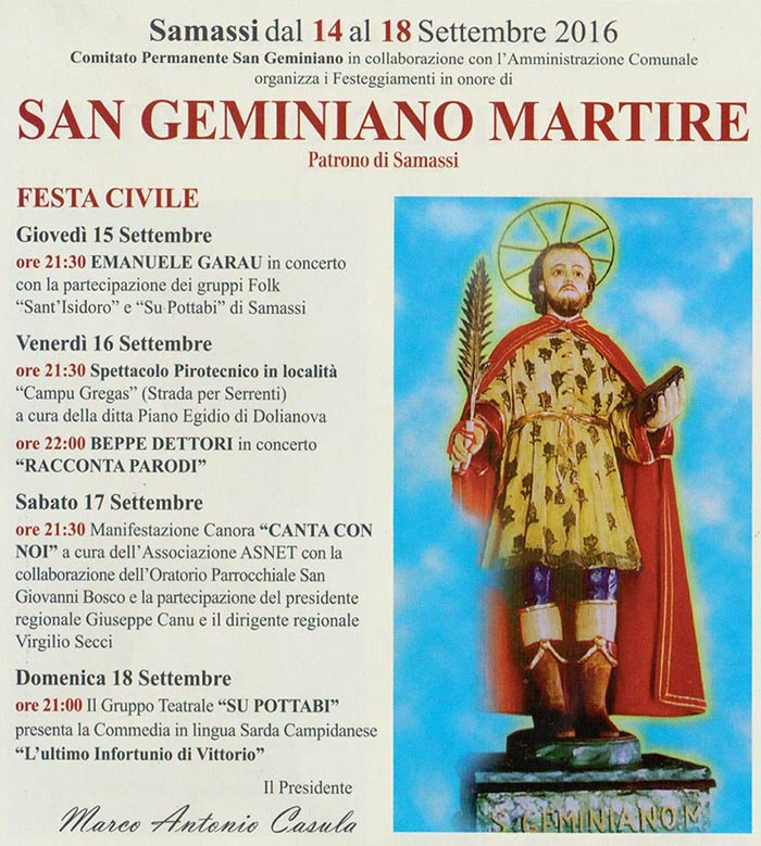Il Comitato Permanente San Geminiano Martire in collaborazione con l’Amministrazione Comunale organizza i Festaggiamenti in onore di SAN GEMINIANO MARTIRE, PATRONO DI SAMASSI.