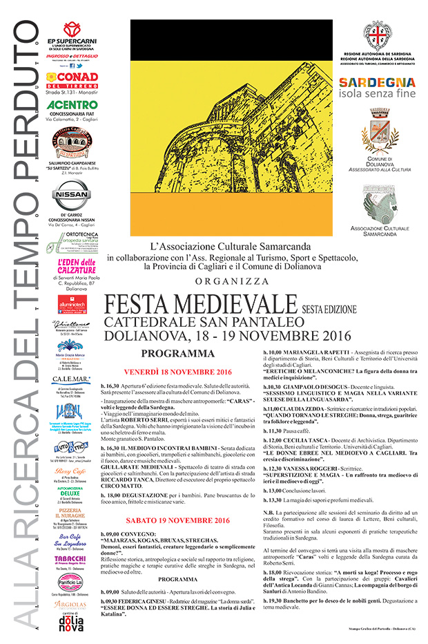 ore  9.00: Convegno “Majarzas, Kogas, Bruxas, Streghas. Demoni, esseri fantastici, creature leggendarie o semplicemente donne?”. Riflessione storica, antropologica e sociale sul rapporto tra religione, pratiche magiche e terapie curative delle streghe in Sardegna, nel medioevo ed oltre. Saluto delle autorità. Apertura lavori del convegno.