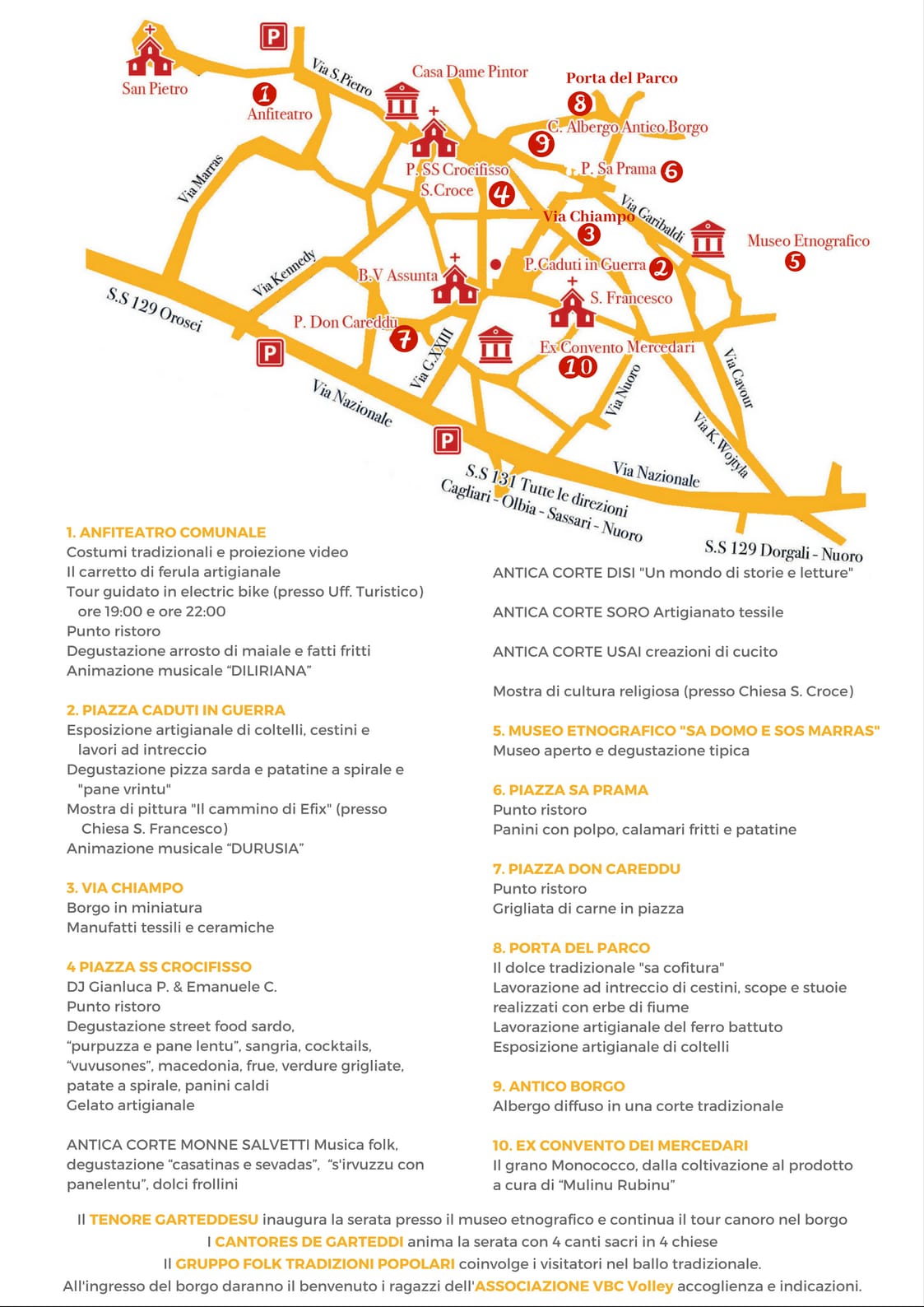 Sarà il cortile del Museo Etnografico “Sa domo de sos Marras” ad inaugurare la serata con i canti del Tenore Garteddesu, mentre numerosi punti ristoro potranno soddisfare ogni palato.