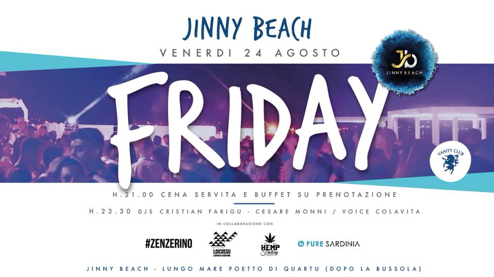FRIDAY – JINNY BEACH – QUARTU SANT’ELENA – VENERDI 24 AGOSTO 2018