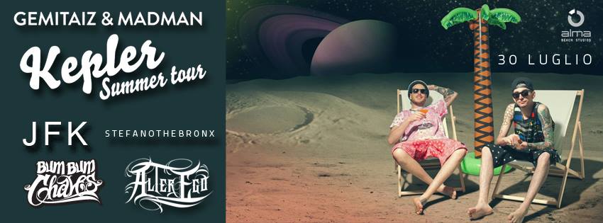 GEMITAIZ& MADMAN KEPLER SUMMER TOUR – ALMA BEACH STUDIOS – QUARTU SANT’ELENA – GIOVEDI 30 LUGLIO 2015