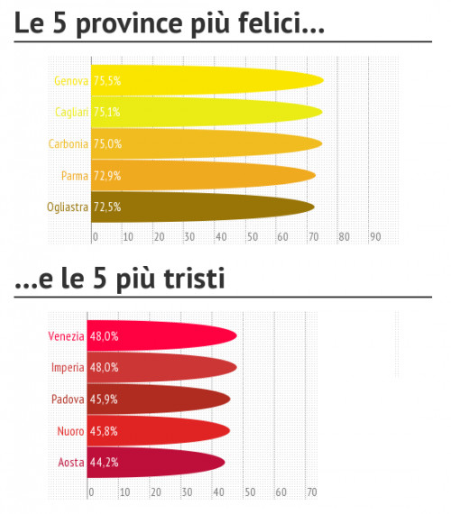 An analysis of more than 40 million Twitter messages collected daily in 110 Italian provinces , shows that in 2013 the capital of happiness in Italy was Genoa. The province of Genoa is an element in first place with 75.5 % of tweets happy. In second place , and within walking distance , we find Cagliari ( 75.1 %), while the top-ten also appear Parma ( fourth with 72.9 % ), Bari (seventh : 71.7 % ) and Bologna ( 71.4% ) , the second in 2012 but this year drops to tenth place.
