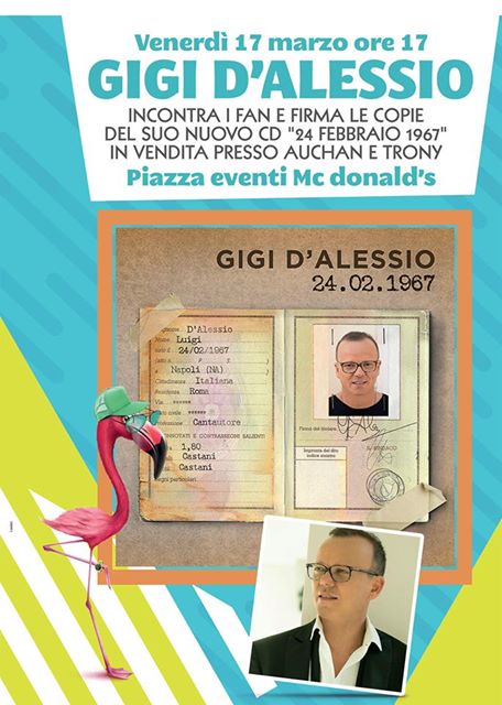 GIGI D’ALESSIO INCONTRA I FAN – AUCHAN SANTA GILLA – CAGLIARI – VENERDI 17 MARZO 2017