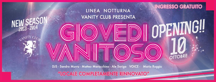 GIOVEDI VANITOSO WINTER SEASON 2013/2014 – LINEA NOTTURNA – CAGLIARI – GIOVEDI 10 OTTOBRE 2013VANITY THURSDAY WINTER SEASON 2013/2014 – LINEA NOTTURNA – CAGLIARI – THURSDAY OCTOBER 10