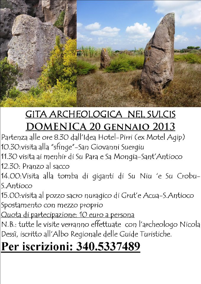 GITA ARCHEOLOGICA NEL SULCIS – DOMENICA 20 GENNAIOARCHAEOLOGICAL TOUR IN SULCIS – SUNDAY JANUARY 20 Reviewed by admin on . Visita ai siti archeologici prenuragici e nuragici del Sulcis domenica 20 gennaio con partenza alle ore 8,30 dall'Idea Hotel di Pirri tel. 340.5337489 Visit to Visita ai siti archeologici prenuragici e nuragici del Sulcis domenica 20 gennaio con partenza alle ore 8,30 dall'Idea Hotel di Pirri tel. 340.5337489 Visit to Rating: