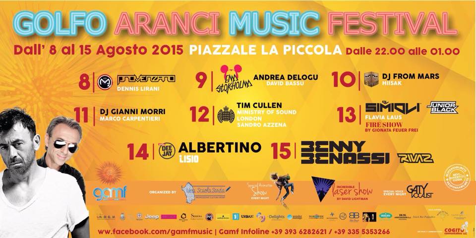 GOLFO ARANCI MUSIC FESTIVAL – GOLFO ARANCI – 8-15 AGOSTO 2015 Reviewed by admin on . Dopo l’enorme successo dell’edizione 2014, in Sardegna, torna GAMF 2015. ¡ Dal 8 al 15 Agosto, il palco più animato d’Italia si accenderà di incredibile musica Dopo l’enorme successo dell’edizione 2014, in Sardegna, torna GAMF 2015. ¡ Dal 8 al 15 Agosto, il palco più animato d’Italia si accenderà di incredibile musica Rating: 0