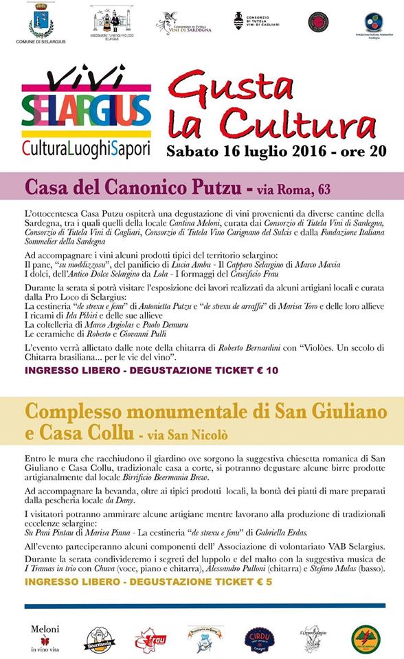 GUSTA LA CULTURA – SELARGIUS – SABATO 16 LUGLIO 2016