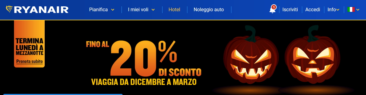 HALLOWEEN RYANAIR : 20% SCONTO PER VIAGGI DA DICEMBRE 2019 A MARZO 2020