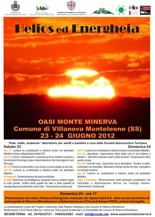 Helios ed Energheia 2012 presso l’ Oasi di Monte Minerva: Ecco il programma completo della due giorni dedicata al cielo, agli astri e alle stelle il 23 e 24 Giugno 2012 a Villanova Monteleone, in occasione del Solstizio d’Estate che in realtà è caduto il 21 Giugno 2012 e che indica il giorno dell’anno col maggior numero di minuti di luce e che per millenni è stato uno dei punti cardine dei calendari, anche magici, delle popolazioni antiche.