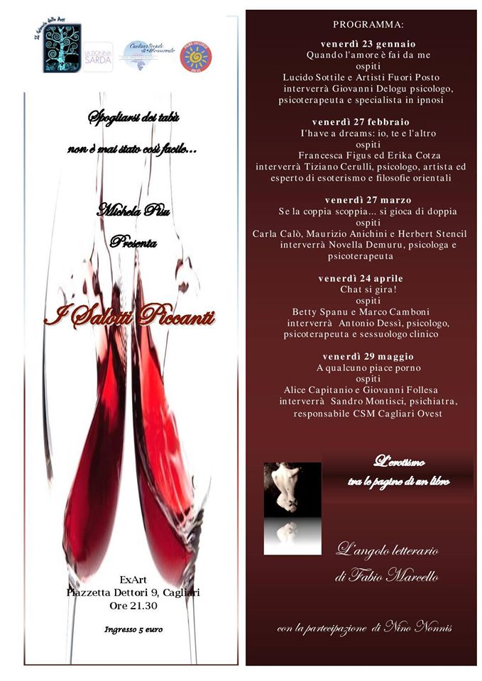 SALOTTIPICCANTITornano a Cagliari dal 23 gennaio al 29 maggio i ‘Salotti piccanti’, introdotti e moderati da Michela Pisu. Cinque incontri con la formula del talk show e due relatori a confronto su temi che spaziano dall’erotismo alla gelosia, dal rapporto di coppia al tradimento, alle fantasie sessuali nell’era del digitale. Questo e altro ancora nella serie di appuntamenti, tutti di venerdì alle 21:30 nell’ex Liceo artistico di piazzetta Dettori.