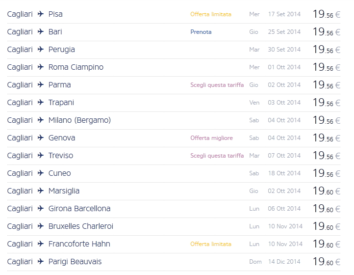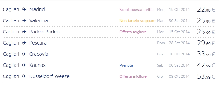 Dando un’occhiata alle offerte da Cagliari, si possono trovare voli per Milano, Barcellona Girona, Madrid, Baden, Kaunas,Cracovia e altre destinazioni a pochi euro.