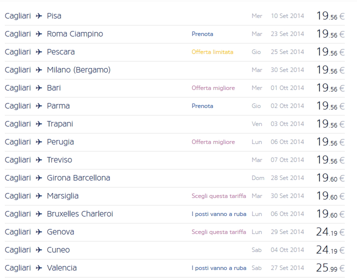 I VOLI IN SVENDITA RYANAIR DA CAGLIARI – GIOVEDI 7 AGOSTO 2014THE SALE FLY RYANAIR FROM CAGLIARI- THURSDAY AUGUST 7,2014