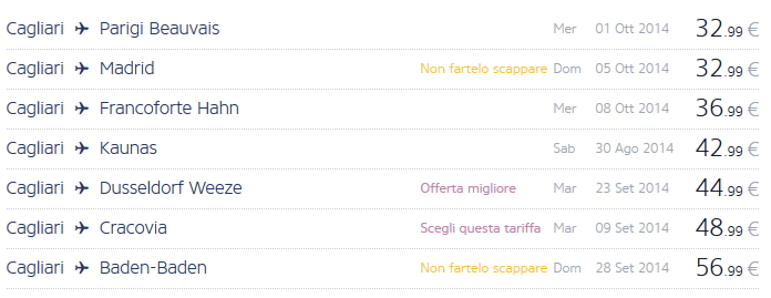 Dando un’occhiata alle offerte da Cagliari, si possono trovare voli per Milano, Barcellona Girona, Madrid, Baden, Kaunas,Cracovia e altre destinazioni a pochi euro.