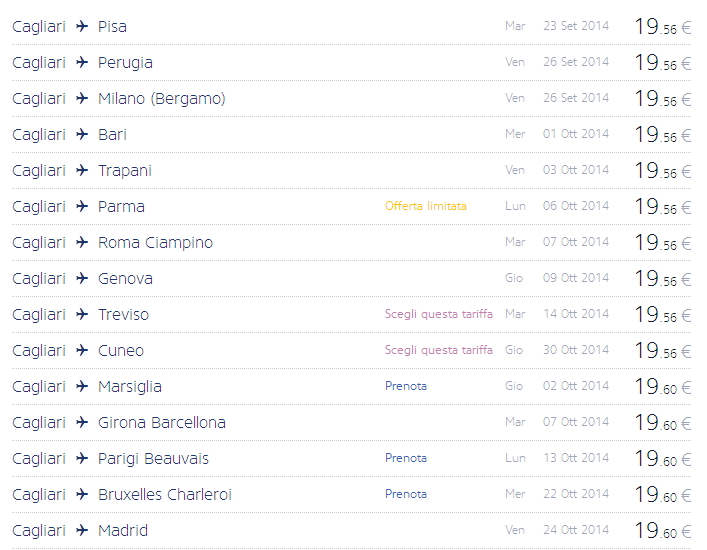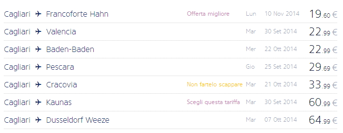 I VOLI IN SVENDITA RYANAIR DA CAGLIARI A PARTIRE DA 19,56 € – GIOVEDI 4 SETTEMBRE 2014SALE FLY RYANAIR FROM CAGLIARI – FROM 19,56 € – THURSDAY SEPTEMBER 4,2014 Reviewed by admin on . Ecco le svendite Ryanair di oggi, giovedi 4 settembre 2014: ci sono tantissimi voli da settembre a dicembre a partire da 19,56 €. E’ un metodo che assomiglia ta Ecco le svendite Ryanair di oggi, giovedi 4 settembre 2014: ci sono tantissimi voli da settembre a dicembre a partire da 19,56 €. E’ un metodo che assomiglia ta Rating: 0