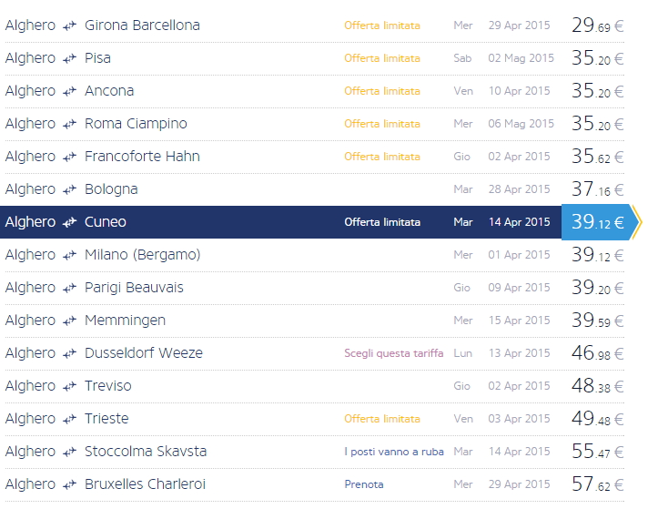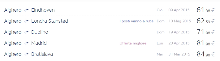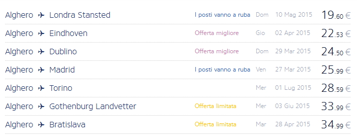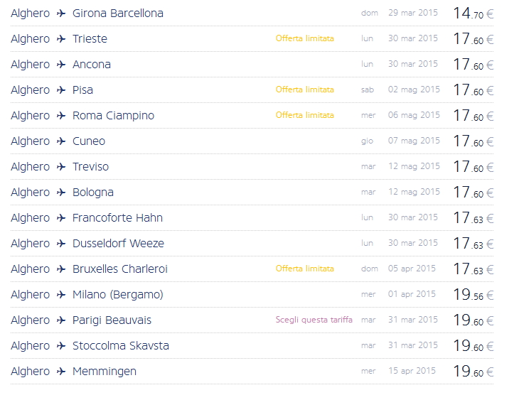 Dando un’occhiata alle offerte da Alghero, si possono trovare voli per Milano, Londra, Billund, Barcellona Girona, Madrid, Baden e altre destinazioni a pochi euro.