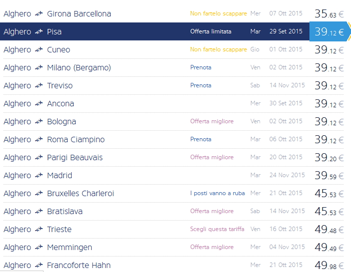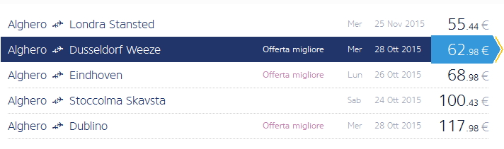 Dando un’occhiata alle offerte da Alghero, si possono trovare voli per Milano, Londra, Billund, Barcellona Girona, Madrid, Baden e altre destinazioni a pochi euro.