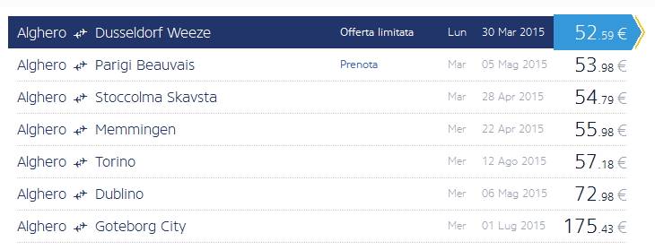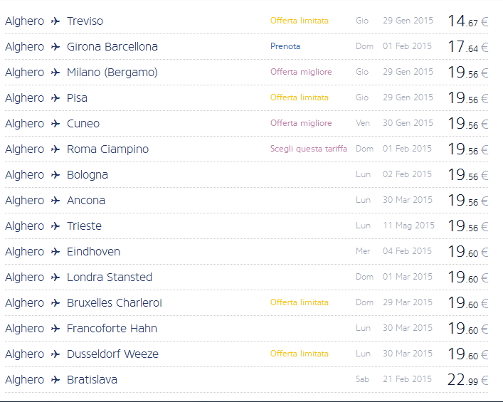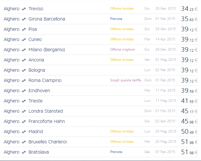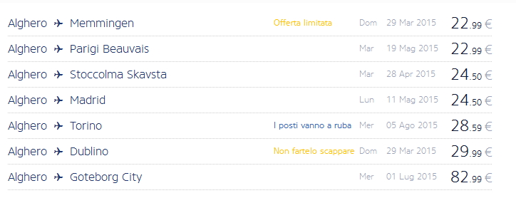 Dando un’occhiata alle offerte da Alghero, si possono trovare voli per Milano, Londra, Billund, Barcellona Girona, Madrid, Baden e altre destinazioni a pochi euro.