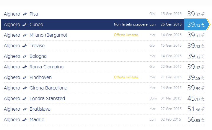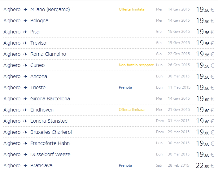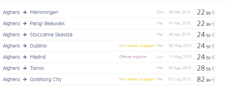 Dando un’occhiata alle offerte da Alghero, si possono trovare voli per Milano, Londra, Billund, Barcellona Girona, Madrid, Baden e altre destinazioni a pochi euro.