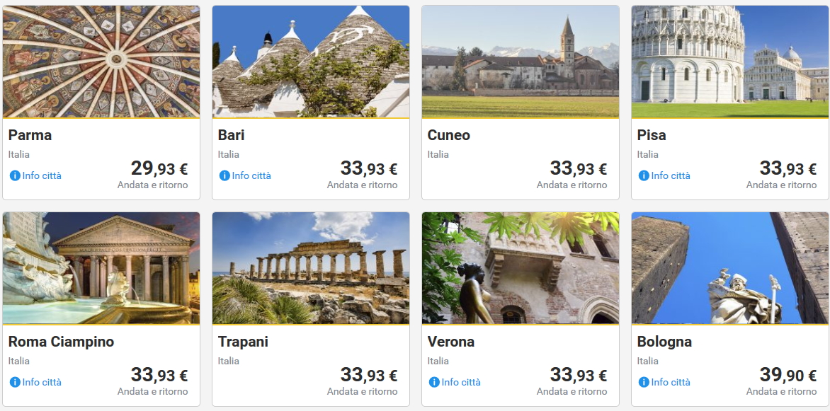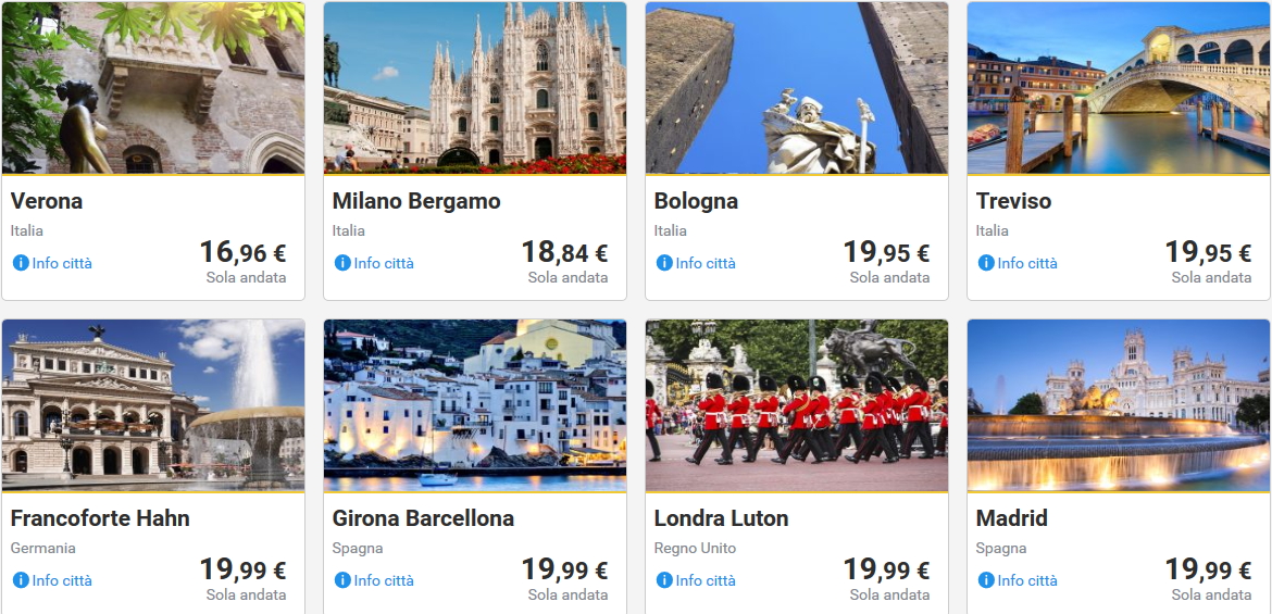 Dando un’occhiata alle offerte da Cagliari, si possono trovare voli per Milano, Bari,Pisa, Verona,Parma, Roma, Francoforte, Parigi, Bruxelles, Cracovia e grande novità Londra Luton, Barcellona Girona, Madrid e Varsavia a pochi euro.