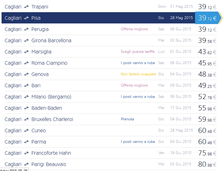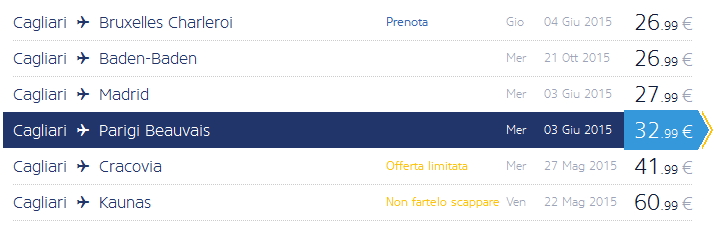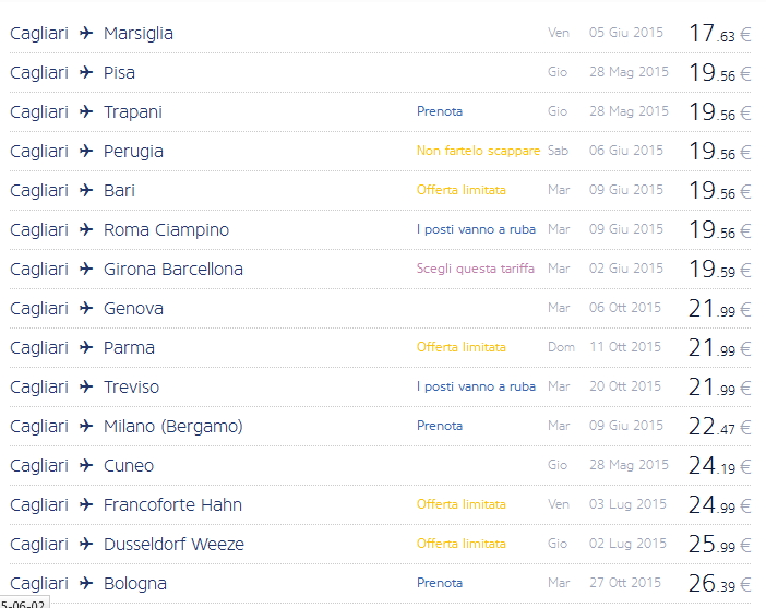 I VOLI IN SVENDITA RYANAIR DA CAGLIARI A PARTIRE DA 17,63 € – GIOVEDI 14 MAGGIO 2015 Reviewed by admin on . Ecco le svendite Ryanair di oggi, giovedi 14 maggio 2015: ci sono tantissimi voli da maggio ad ottobre a partire da 17,63€ E’ un metodo che assomiglia tantissim Ecco le svendite Ryanair di oggi, giovedi 14 maggio 2015: ci sono tantissimi voli da maggio ad ottobre a partire da 17,63€ E’ un metodo che assomiglia tantissim Rating: 0