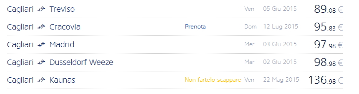 Di seguito troverete gli screenshot prima dei voli solo andata da Cagliari e poi andata e ritorno calcolata per una media viaggio di 3-7 giorni.