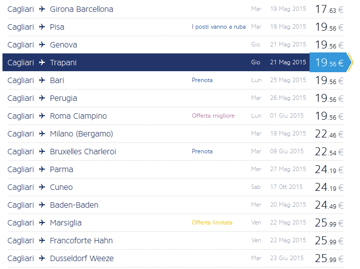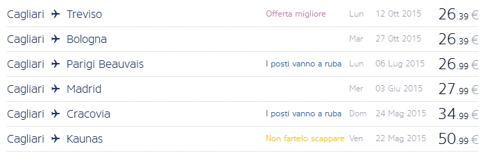 Dando un’occhiata alle offerte da Cagliari, si possono trovare voli per Milano, Barcellona Girona, Madrid, Baden, Kaunas,Cracovia e altre destinazioni a pochi euro.